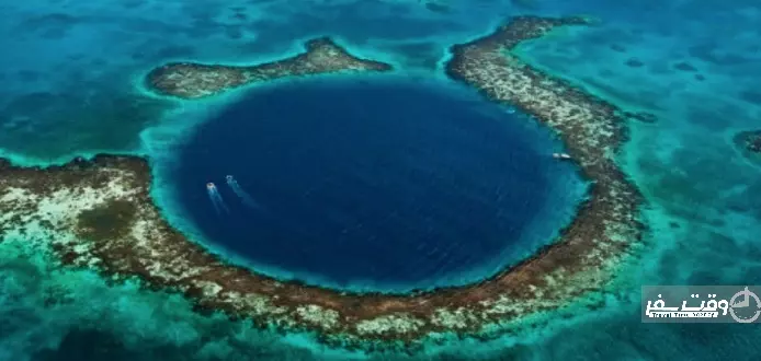 حفره آبی، در بلیز. یکی از بزرگ ترین حفرههای آبی کره زمین، این حفره عمیق آبی در زیر آبهای ساحل بازیل امتداد دارد.
